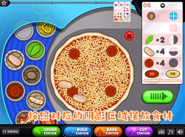 3、然后就该放料了,对着右边订单上的示意图,看好阴影区域在哪,就把食材摆在哪。(记住,料要撒得均匀点,别堆一块儿)