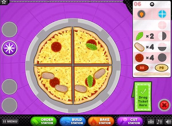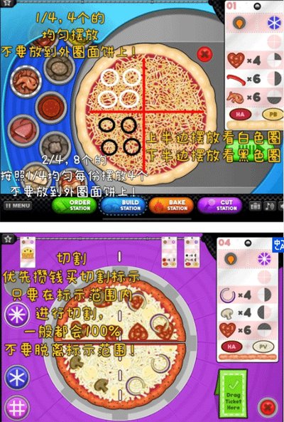 4、切披萨,订单要求切四块就切四块。强烈建议攒钱先去商店里买个切割辅助线,切的时候屏幕上会出现虚线,沿着它切准没错。