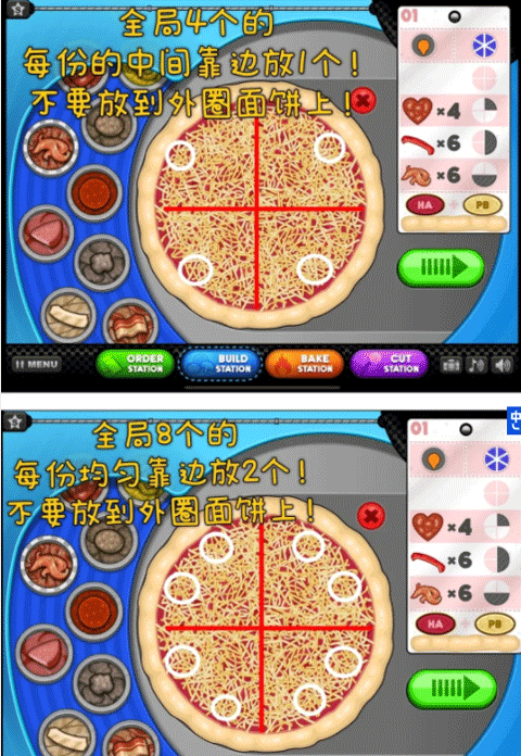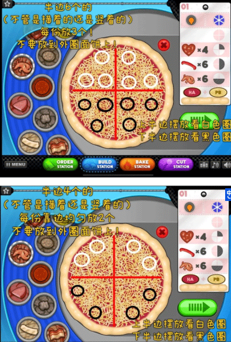 5、如果要求在半个披萨上铺6个食材,那就是一半的区域里,每等分放3个!(不管订单是要求横着铺半边还是竖着铺半边都一样)还是那句话,别扔到饼边上!(下面这张图里有画)