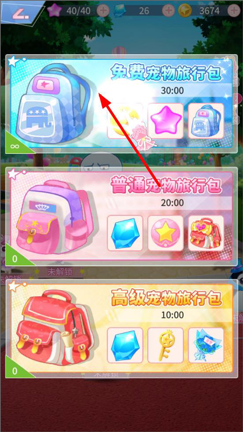 3、在这里,你可以领取免费的宠物旅行包。宠物在旅行的过程中会为你带回各种奖励。领取旅行包之后,你的小可爱就可以出发去探索世界啦。