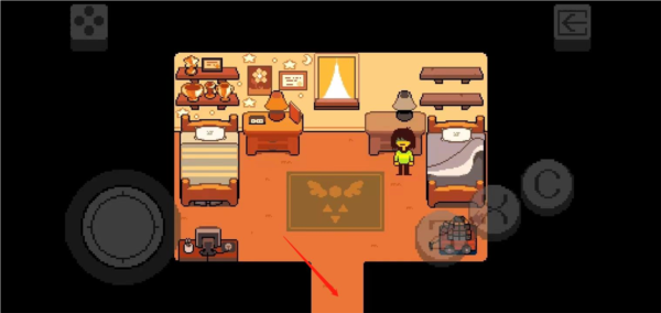 4、搞定上面那些,总算正式开始了。为了防止上学迟到,羊妈托丽尔呼喊着克里斯(Kris)的名字,催促你赶紧起床。。。(按“乙”键继续对话),你就得控制Kris爬起来出门。搓左边摇杆让Kris走到箭头指的地方,场景就会自动切换。
