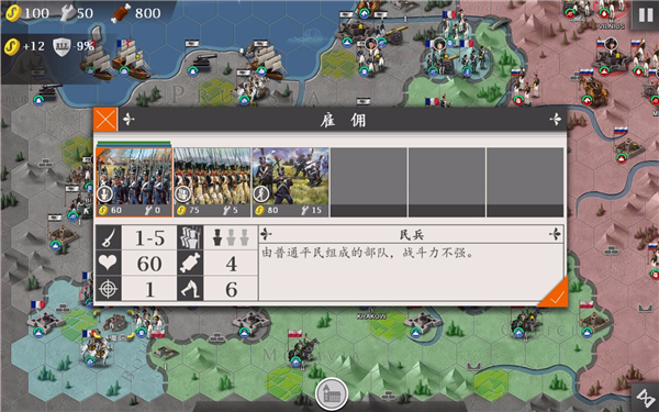 步兵类兵种在城市里招募:民兵、线列步兵、轻步兵、掷弹兵、近卫军、机枪。
