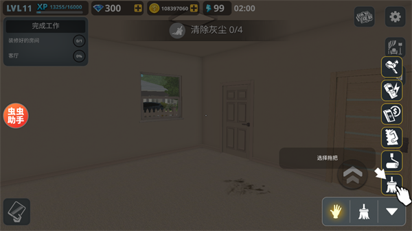 3、到了客户家,任务提示让你搞卫生。先点开工具栏,把拖把给选上。