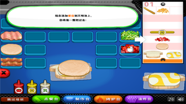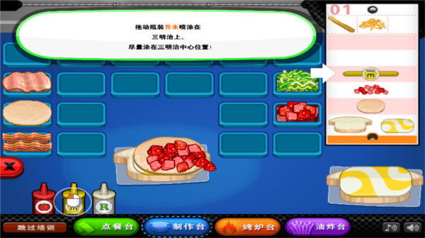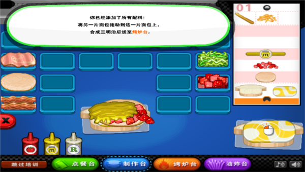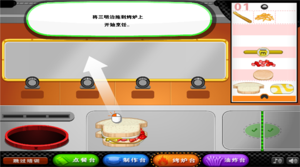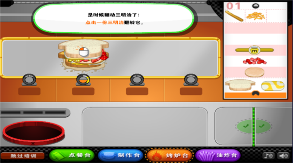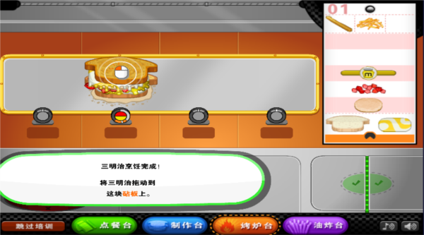6、三明治的制作过程呈现得十分完整,从选面包、添加食材到烘烤出炉,每一步都有清晰展示,让玩家更容易上手并掌握制作节奏。