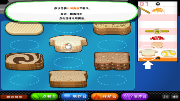 3、进入制作台后,根据顾客需求选择对应的面包类型。例如顾客点的是吐司三明治,就需要在面包列表中选择吐司作为基础。