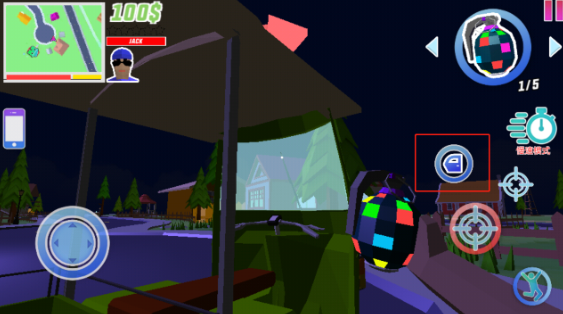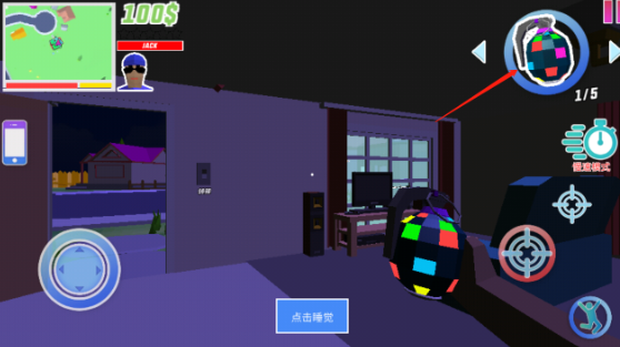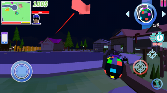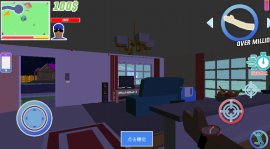 7、左侧控制移动,右侧分别为攻击、瞄准与跳跃按钮,右上角可切换工具。