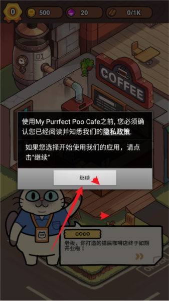 1、初次打开游戏后,直接点一下“继续”按钮就能开始你的咖啡店之旅啦。
