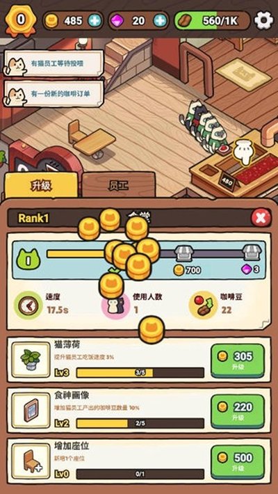 3.拥有一支优秀的团队,持续的培养和成长是必不可少的。在游戏中,你可以为你的猫咪员工们投入资源进行培训,帮助它们不断提升自己的专业技能和综合能力。通过开设各种培训课程,或者设立一些奖励机制来激发它们的工作热情,这些可爱的员工们会变得越来越能干。员工能力的提升,最终会直接体现在咖啡的品质和制作效率上,为你带来更高的声誉和更多的收益,形成一个良性的发展循环。