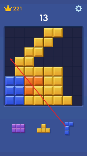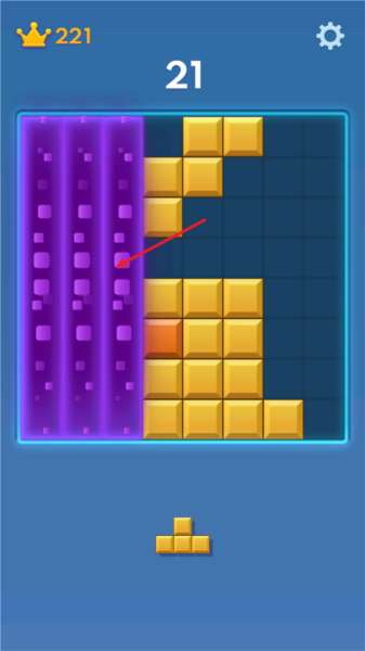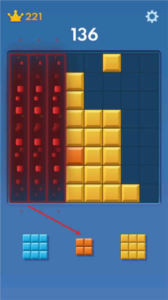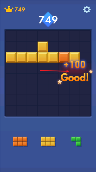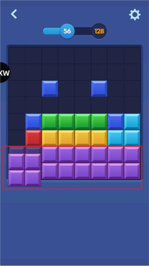 2、当一整行或者一整列被方块填满,就会“叮”一下消除掉,同时给你加上分数。