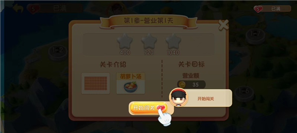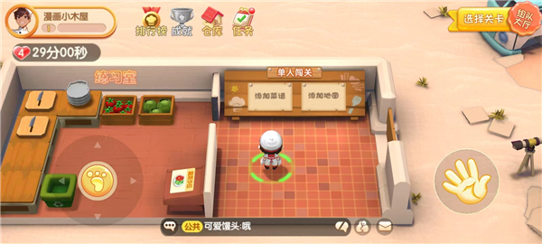 3、恭喜你,熬过教程总算出村了。看到这个界面没,这就是你的秘密基地,也就是后厨。你可以在这里练手,也可以从这里出发去闯关开店。