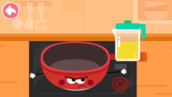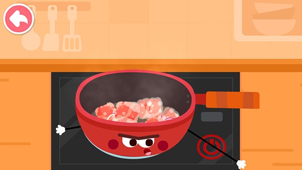4、正式开始做菜时,可爱的小厨具会自动生火,宝宝只需要按照引导把调料和食材倒进锅里就行啦。