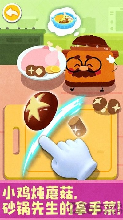 接下来有请砂锅爷爷出场。你看,它已经提前装了半锅水,就等着烹饪小鸡炖蘑菇了。小鸡“扑通”一声就跳进了砂锅里。宝宝可以发挥创意,给蘑菇设计一个时髦的造型,处理好之后,砂锅爷爷就要开始施展它的厨艺了,它还能做出美味的胡萝卜炖牛腩呢!