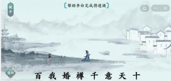 -【帮助李白完成将进酒】先点一下李白,他会说出“人生”,然后你把“意”字拖到李白身上。