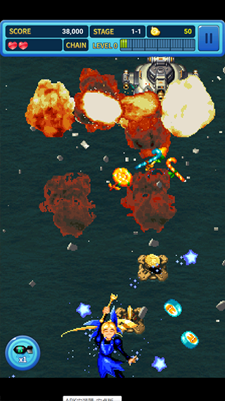 点击炸弹按钮:炸弹键就是保险,点一下清屏,还能暂时无敌,老规矩了。