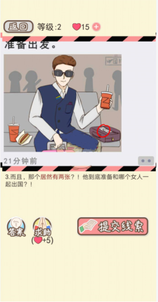 7、在场景里到处点点点,找到可疑的东西就能拿到对话截图、票根之类的证据。