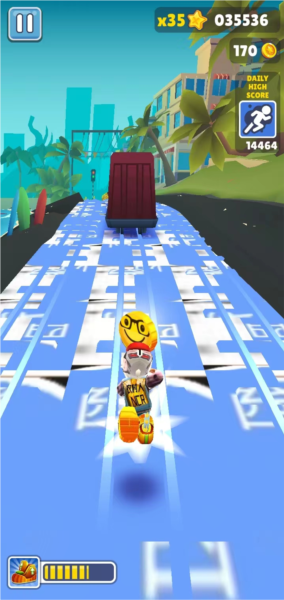 1、核心玩法就是操控你选的角色在各种轨道上撒丫子狂奔。反应一定要快,灵活地左右横跳来躲开那些迎面撞过来的障碍物,同时别忘了多吃点金币和钻石,这些可是后面买东西的硬通货。