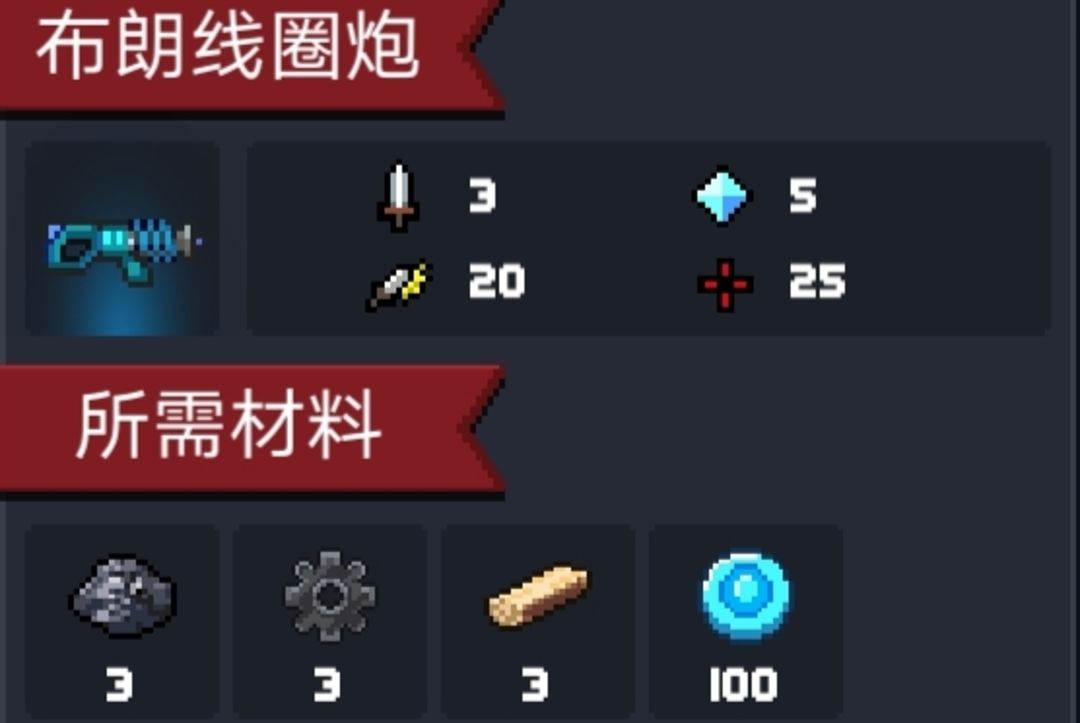 线圈炮这系列里唯一能拿得出手的一把。一枪打5颗小炮弹,默认能弹4次。按住攻击会减移速。这枪刚出的时候,子弹挺大的,清图能力一流,号称小“天堂之拳”。现在虽然被砍了一刀,但在狂战士雕像之类的加成下,还是能找回点当年的风采。(话说回来,这明明是激光武器,为啥在锻造台里被分到霰弹枪那类?)