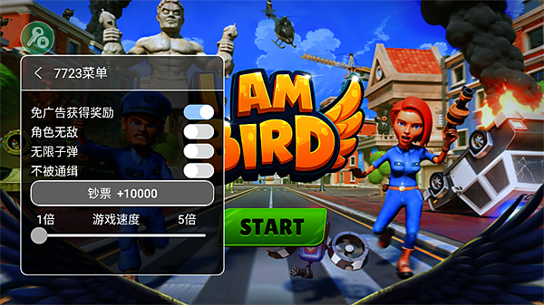 2、点开之后,好家伙,菜单直接弹出来了。什么免广告、无敌、无限子弹之类的功能都在这。想爽的直接勾上,然后就可以点‘start’开干了。你们看,就是这个界面。