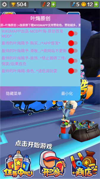 5、该版本的内置菜单是全中文版本,并不需要为大家过多的赘述,分别是解锁免费购物,一键解锁全角色、滑板、背饰的强大功能,点击相关功能右侧对应的按键即可开启。
