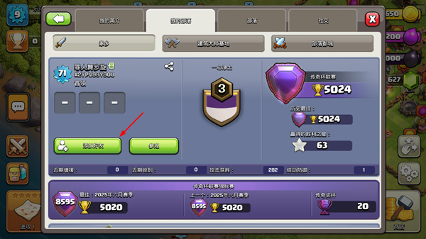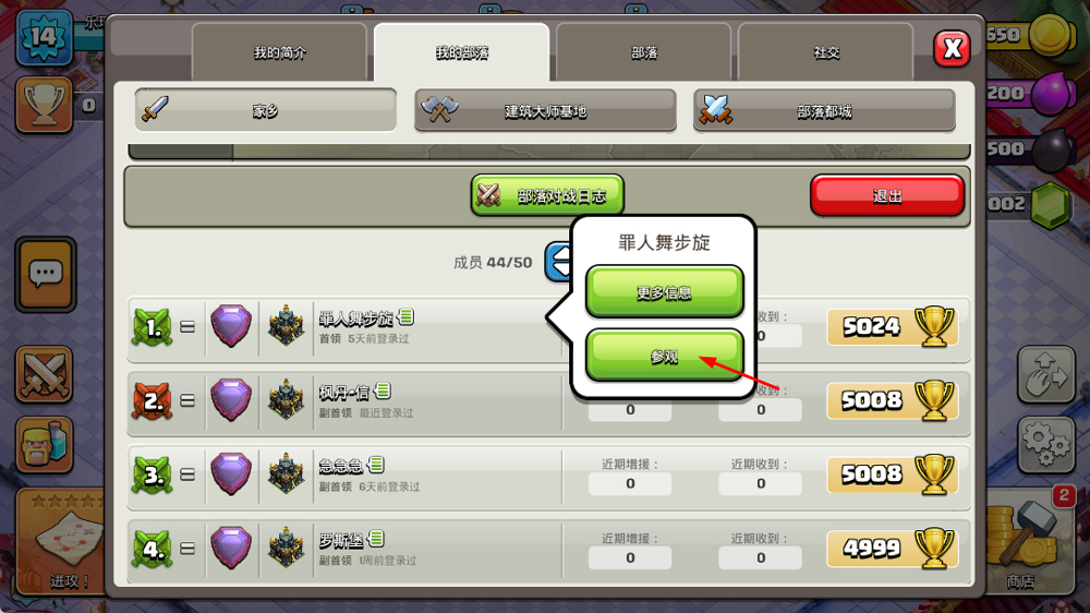1、进了游戏,点开部落,找一个你觉得阵型摆得不错的哥们,点他的名字,然后选“参观”。
