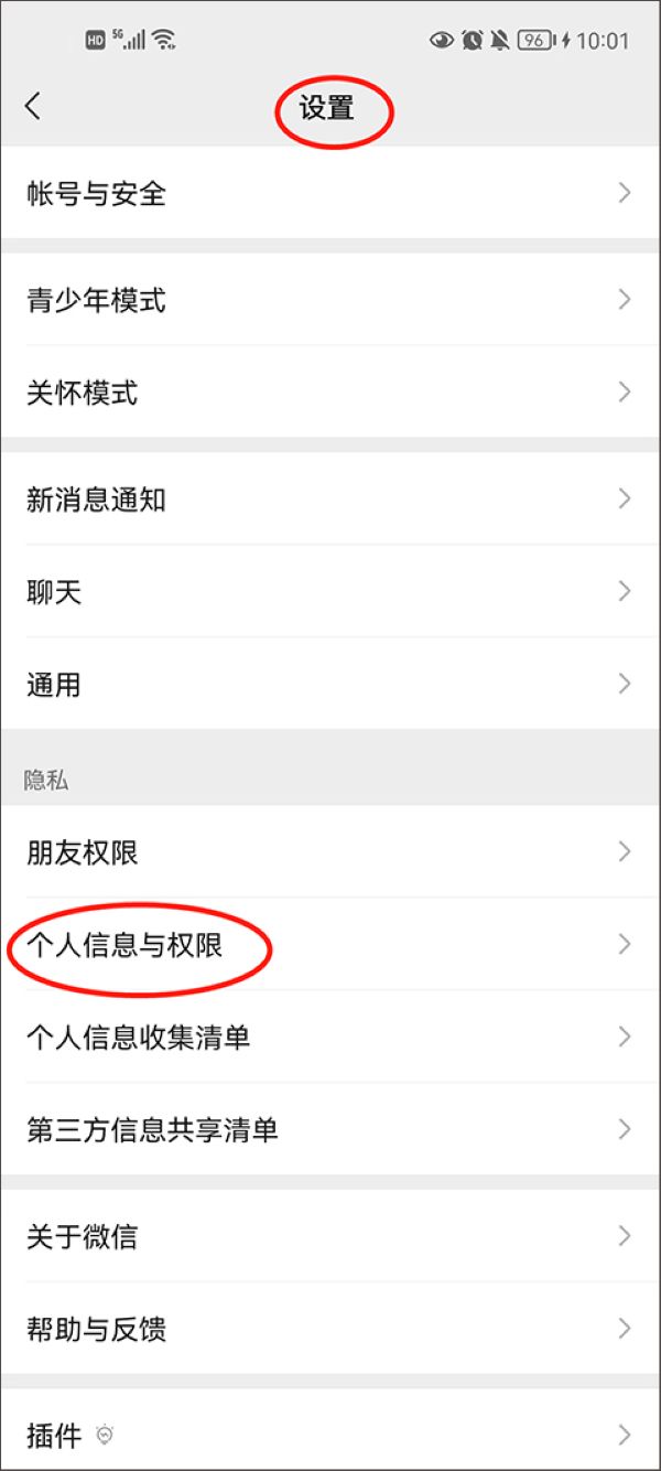 1、先打开你的微信,进到【设置】里,找到那个【个人信息与权限】的选项点进去。
