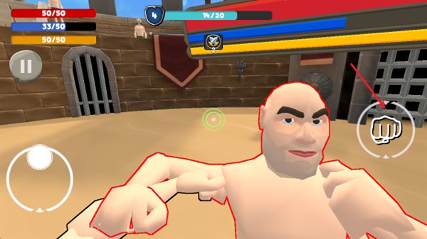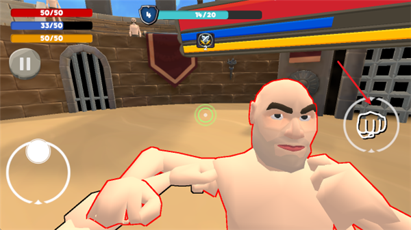 1、操作挺复古的,左半边屏幕当摇杆控制移动,按住右边的拳头图标是蓄力攻击,松手就砸出去了。简单粗暴,上手没啥门槛。大家看下面这张截图就懂了。