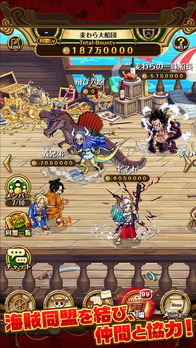 《One Piece Treasure Cruise》日服,这玩意儿算是个动漫角色扮演的老古董了,全球下载量破亿,老玩家应该都知道。核心玩法就是跟着路飞、索隆、娜美这帮人,重走伟大航路。你可以把草帽团原班人马凑齐,也能搞点邪道玩法,把七武海、白胡子海贼团的人拉进自己队伍里。游戏里还能收集“前进梅利号”和“万里阳光号”这些经典船只,开着船从东海出发,一路冒险。可以说,只要你在海贼王里见过脸的角色,这游戏里基本都能找到。