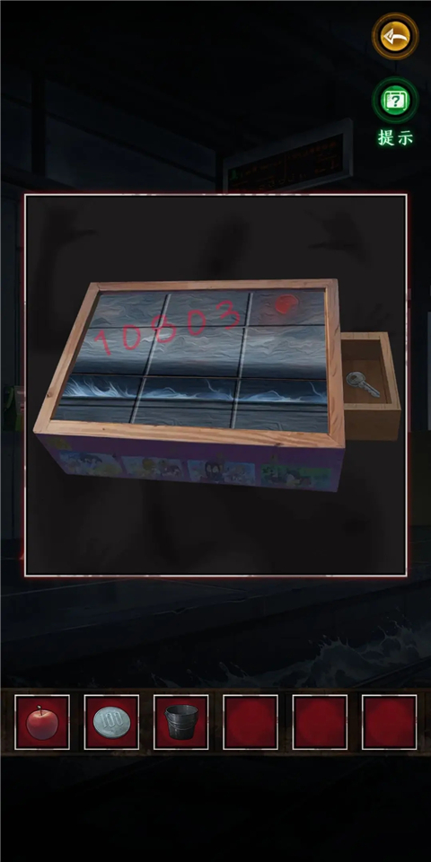 10、拿着钥匙去开候车室的门。进去后根据外面饮料机里饮料的排列位置,去调整箱子上的机关,弄完就能拿到一把小刀。