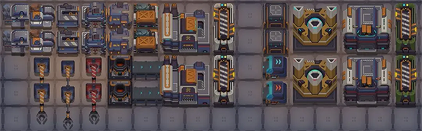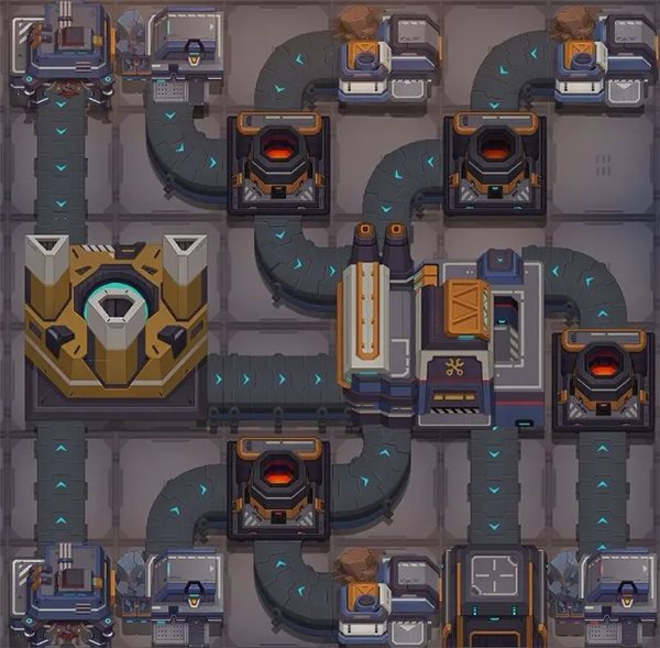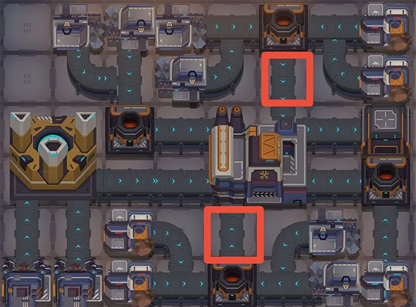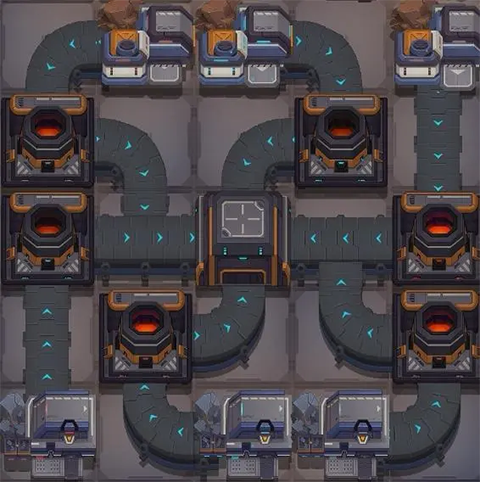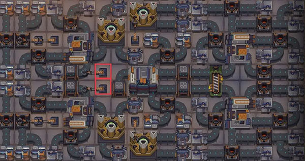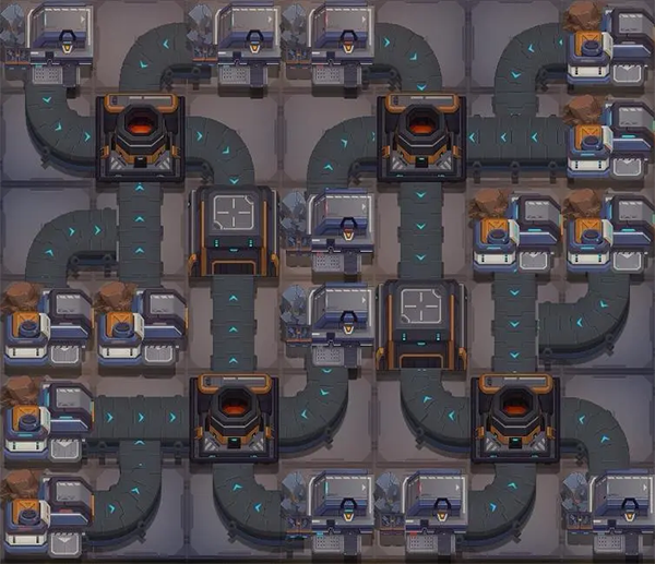 这个模块最高只用到二级建筑,那两个油厂甚至一级就够了。下面这张图是两个模块拼起来的,你拆开用也行。缺点是刚摆好的时候可能会因为混料卡住,手动收几次矿就通了。产值是0.4636,产值怎么算后面会说。