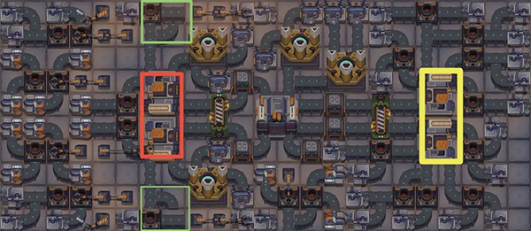 给你们解释下,红框里的车间是产钢板和绝缘线的,黄框里的是产钢板和螺丝的。请注意绿框内的传送带,其断口为特意设计,并非失误,请勿将其连接。。产能效率看下面这张图就懂了。