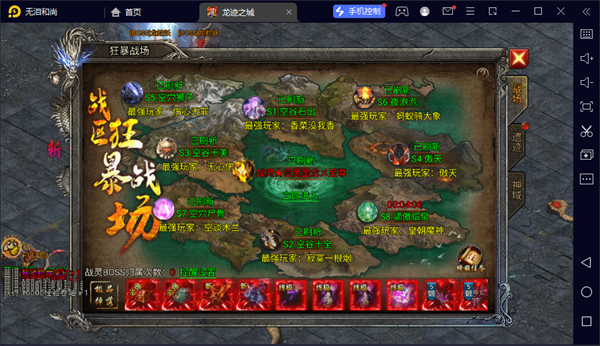 狂暴战场这玩意儿,要新服开到第八天才开,是个跨服干架的地图。进去之后分两个区,一个是狂暴战场,另一个是战场遗迹,里面刷的boss不一样。你点开战场地图,能看到s1到s8这八个服务器的顶尖大佬,地图中间有个大大的“立即进入”,点了就进去了。刚开的时候,狂暴战场里头就5只狂暴至尊级的boss,名字都挺唬人,像什么黄金暴龙、司命阎罗之类的。
