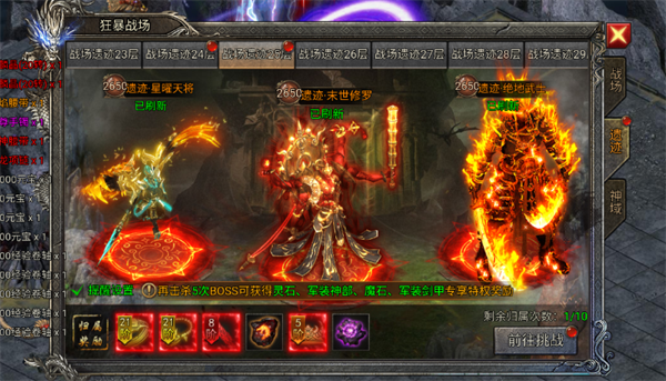 战场遗迹那个图,每天默认给你五次进入机会。每一层都有三个boss守着,想去更高层,你就得升级军装。废话不多说,层数越高,掉的东西肯定越好。