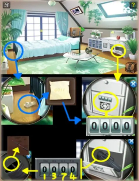 1、先看主场景,床底下左边有个纸条,点了。然后去搞右边的柜子,密码是0011,打开后里面有个黑筒,再输个密码13741,就能拿到鱼竿了。