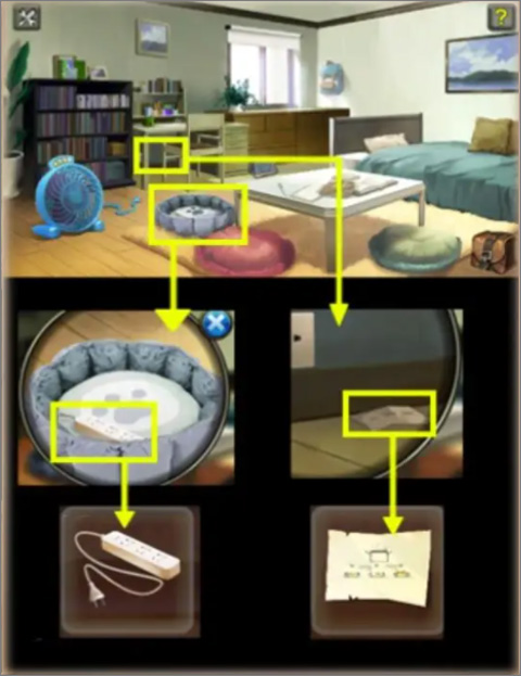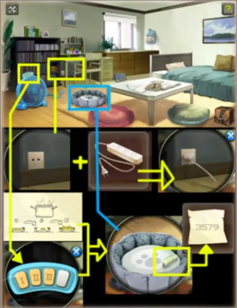 2、看到那个电风扇了吧,对着它上面点。按照刚拿到那张纸条的提示,挨个点2档、1档、3档。风扇里藏的另一张纸条就会被吹到狗窝里。回去狗窝再点一下,拿到新纸条,看看到底写了啥。