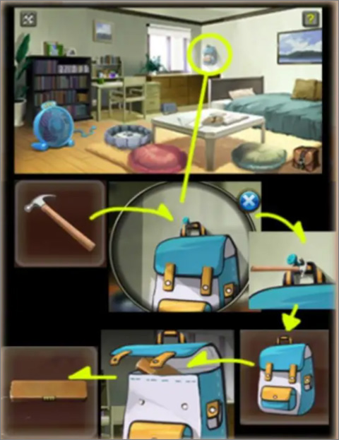 4、看到那个书包没,上面有钉子。用刚拿到的锤子把钉子敲掉,书包就能打开了,里面是个文具盒。