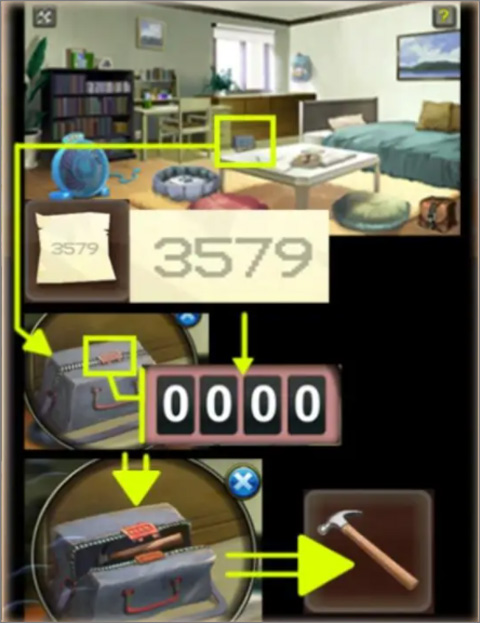 3、去窗户下面的工具箱,根据新纸条给的提示,把密码输进去,就能拿到一把锤子。