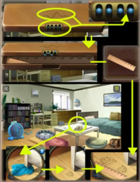 5、仔细看文具盒上的图案,这就是密码提示。输对密码打开文具盒,拿到一把直尺。然后去床的右边,把布掀开,用尺子量一下地上的脚印。
