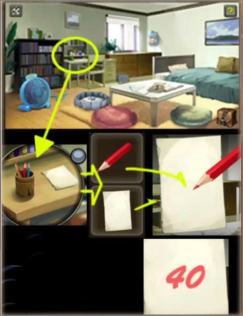 6、回到书桌右边的桌子,上面有纸和笔,拿起来。用笔在纸上写下鞋码,正确的是40,别写成41了。