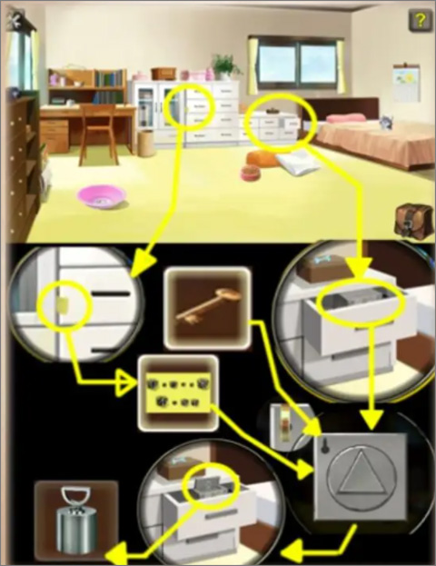 4、中间那个抽屉里有张黄纸条,留意一下上面字的大小。用刚换来的钥匙打开抽屉,根据纸条上字的大小顺序,去点那个图案锁,打开后得到一个砝码。