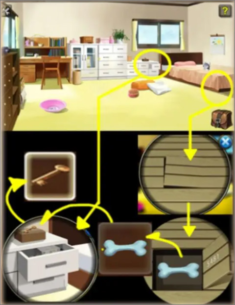 3、点床旁边的地板,掀开能拿到一根小骨头,顺便记下地板下面的数字。然后去床左边的抽屉,用骨头把上面的钥匙换下来。