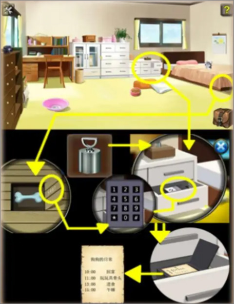 5、用砝码把小骨头换下来,第二层抽屉就开了。输入密码5481,能拿到一份“狗狗日常表”,这玩意是用来推测狗啥时候丢的。