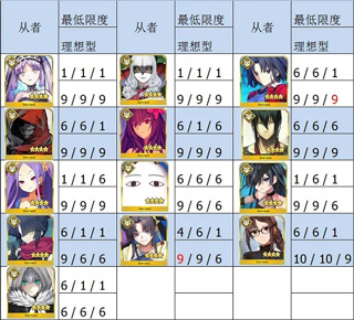 2.这篇推荐主要是参考了AppMedia上的数据,然后结合我自己的使用体感,对一些从者的推荐等级做了点修改,整理出了下面的表格。每个从者我都给了两个推荐数据:一个是“能用就行”的最低标准,另一个是“比较理想”的强化状态。标红字的技能,是那些值得砸个结晶升到10级的。不过嘛,从者多结晶少,这玩意儿金贵得很,最后怎么点还得看你自己的BOX和需求。