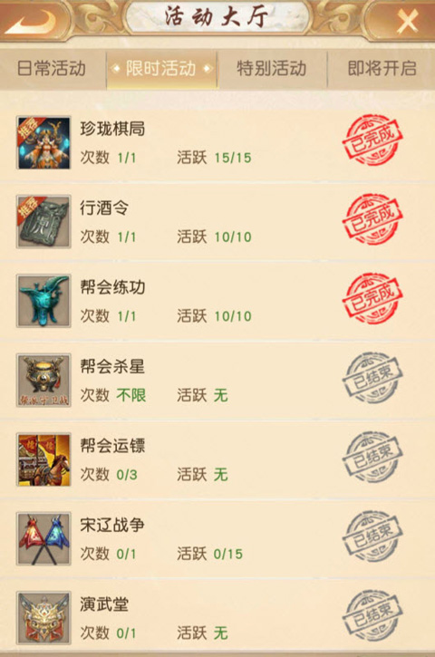 然后就是那些限时活动了。经验值的主要来源包括:每日19点举行的帮会行酒令与练功、每日的珍珑棋局、每周的跑环任务,以及每周各一次的蹴鞠和演武场活动。。这里得说一句,找个好点的、人多的大帮会很重要。行酒令的时候,在线超过12个人一起吃才能拿满经验,人少了经验就有折扣。练功最好是组等级差10级以上的队友,这样经验会多一些。