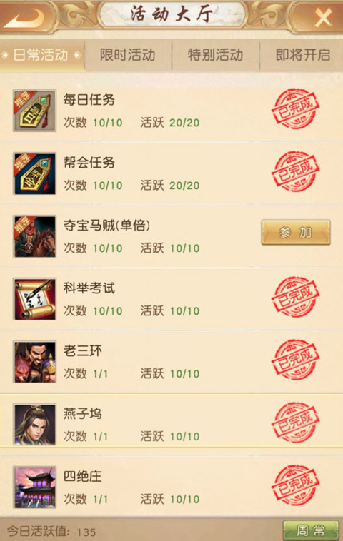 以我个人情况为例,在镶嵌三级宝石、获得二代六星松鼠、并激活32级神器与初级重楼肩之后,即便尚未完成3000只野怪的击杀任务,我的战力也已超过九万。目前英雄试炼的进度是第39关,角色等级暂时停留在37级。。这时候主线支线都没了,就可以开始扫荡活动了。比如每日任务、帮会任务、科举考试、惩凶打图、分金定穴这些单人就能干的。支线里也会有去古墓打怪的任务,多打几个怪,争取升到40级。到了40级再回城去做夺宝马贼、老三环、燕子坞这些多人活动。因为40级以上参加这些活动,掉的是40级的门派套装,比你30多级去做活动拿30级装备,战力高不少。在前期没法做手工装的时候,门派套就是最好的装备,而且经验也更多。