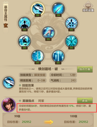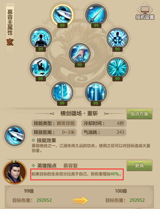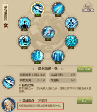 苏星河指点之后,横剑疆场打被减速的目标,伤害能提升40%。慕容自己就有星河虹吸和破天式这两个减速技能,所以只要你控制好放技能的顺序,给目标挂上减速,打出140%的伤害还是挺轻松的,PK的时候有点用。
