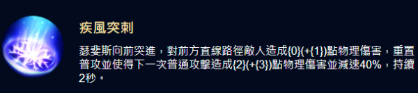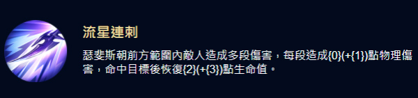 瑟斐斯朝前方一顿乱捅,对范围内的敌人造成105(+74)的物理伤害。