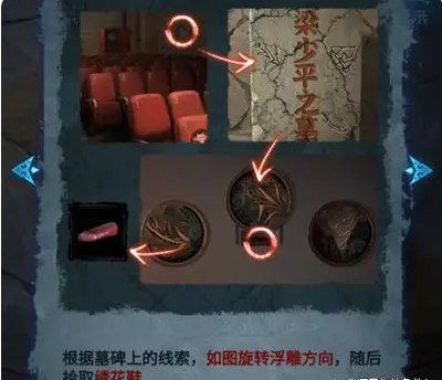 10、墓碑上有线索,照着提示去转那个浮雕机关,打开后拿到一双绣花鞋。看下面这张截图的位置。