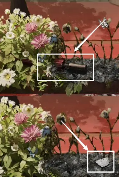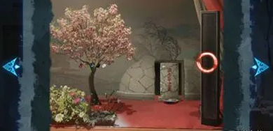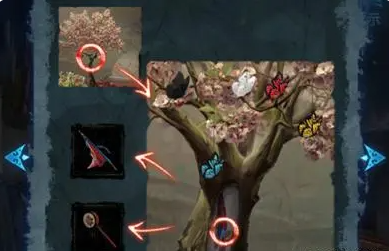 26、回到戏台,根据木偶戏台手机里的线索,调整树上蝴蝶的位置和高低,调整对了就能拿到拨浪鼓和靠旗。
