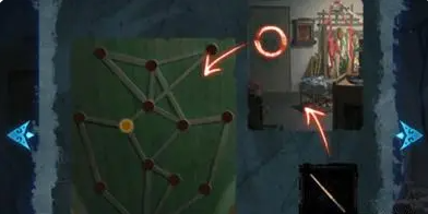 17、拿着蘸了红油彩的笔,去门上的脸谱那儿玩个一笔画,画对了就能打开通往仓库的门。