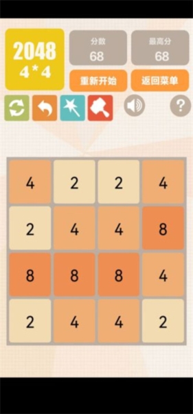 基本规则就不废话了,玩两把就明白。给个老玩家的忠告,想玩得轻松点,就记住一条:尽量别按[↑]方向键。开局先把大数往右下角堆,比如第四行凑成2-2-4-32这种。然后按两下[→],就变成8-32了。这时候上面几行肯定会刷出2或者4,按[←]把它们挪到左边,再按[↓]沉下去。要是情况复杂点,比如变成了4-2-8-32,那你就得想办法在第三行的第二个位置搞个2出来,然后向下合并再向右,就能凑出16-32。道理就是这么个道理,不断用小数字合成大数字,后面步骤会越来越多,但思路不变。当数字较大时,右下角一行应尽可能保持64-128-256-512这样的递增顺序。如果排列为256-64-256-512这种混乱的次序,那么局面将很难挽回。。